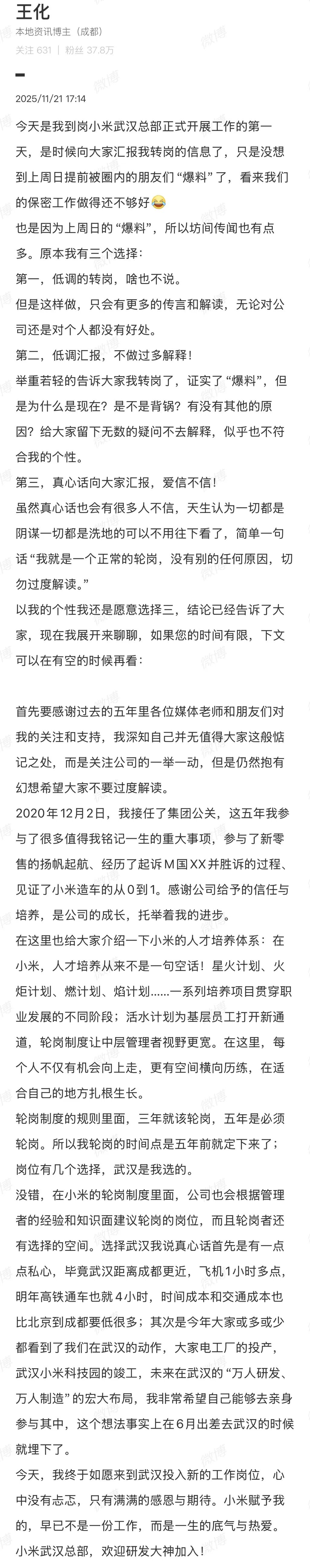 11月21日,王化在个人社交账号发文称,今天是其到岗小米武汉总部正式开展工作的第一天,是时候向大家汇报转岗的信息了。他表示,轮岗的时间点是五年前就定下来了,武汉是自己选的。